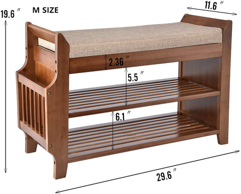 - ăMULTIFUNCTIONAL BAMBOO BENCHă 100% phyllostachys pubescens, environment friendly and sturdy. Smooth surface can effectively protect your family from being scratched, especially the children. 2 tiers Shoe Rack Organizer for shoes, boots, bags in entryway, bedroom, bathroom, closet, etc.