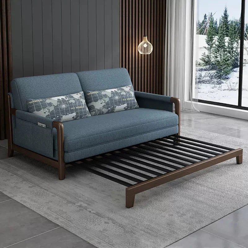 Pull Out Sleeper Sofa Bed with Armrest Storage Pockets Cotton Linen Walnut Frame